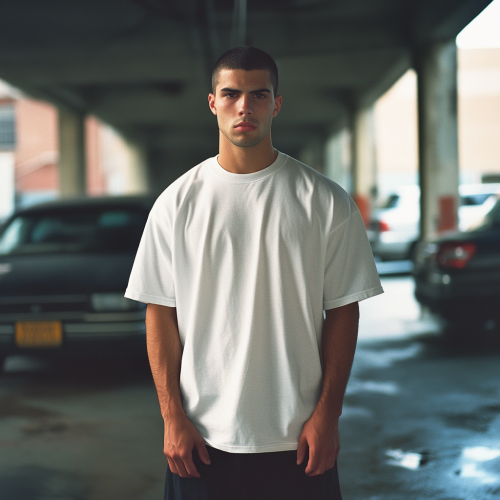 a realistic american model man and using white oversized tshirt, high quality tshirt, the backgorund is in a car basement , shot with kodak portra 400 film, the camera shoot from front,