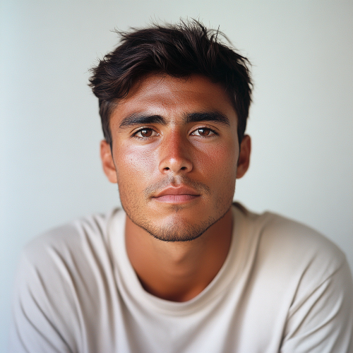 photo of a mexican-portuguese man, oblong face, dark brown hair, dark brown eyes, and tan skin. He is wearing a plain matte-colored t-shirt. Shot on kodak portra 160 film --s 250