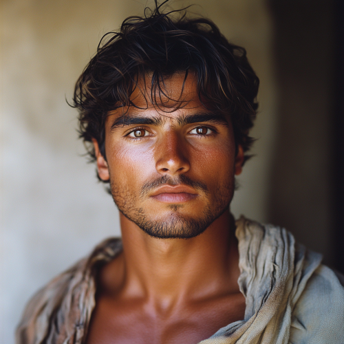 photo of a mexican-portuguese man, dark brown hair, dark brown eyes, and tan skin. He is wearing a tattered medieval robe. Shot on kodak portra 160 film --s 250