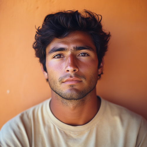 American-Mexican-Portuguese man with oblong face. Dark brown hair, eyes, tan skin. Plain t-shirt. Kodak Portra 160 film.