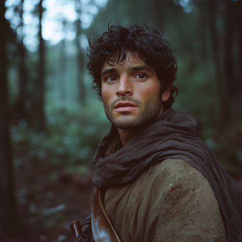 photo of a portuguese man, oblong face, large strong nose, dark brown hair, dark soft brown eyes, and tan skin. Behind him is a dark dense forest. He is wearing medieval traveling clothes and a dense dark cloak. Shot on kodak portra 160 film --s 250