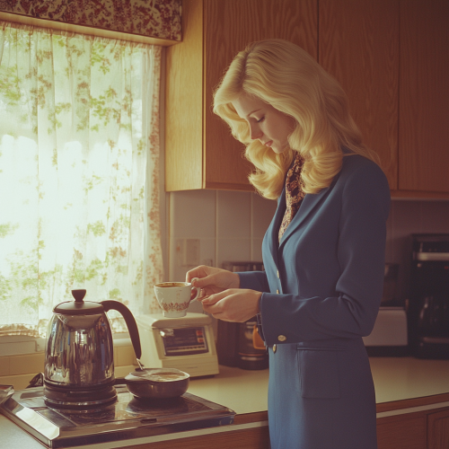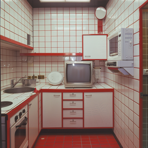 1980’s minimal kitchen design with inexpert red trim tiles. An art installation has been installed in the Centre, it’s depicting the children’s TV UK program nightmare. --v 6.0 --style raw
