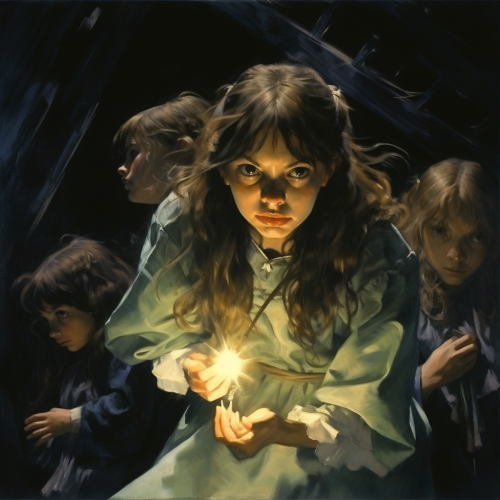 a 1980’s dark fantasy art version of a painting of the group of supernatural girls known as the adventure stars versus the alien sorcerer Salvar Osket painted by Jamie Wyeth