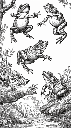 1970s dark fantasy dungeons and dragons paper cover art coloring book style illustration of a group of American bullfrogs jumping up in a joyous posture, in a natural and detailed landscape, black and white line art only --v 6.0 --ar 9:16