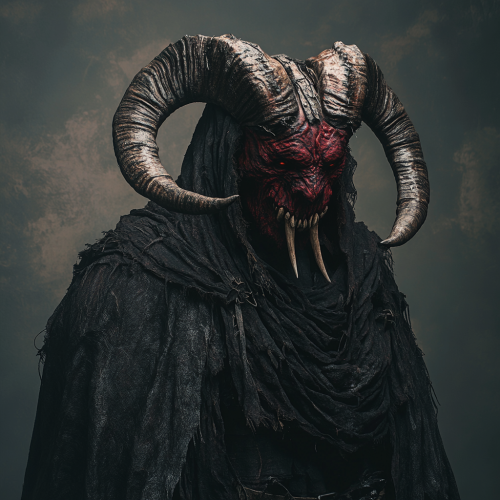 Hulking inhuman warlock with antlers and red skin. He is muscular and scarred, with jagged teeth. He wears a strange mask and a cloak that distorts the air around him. Dark fantasy. Photo-realistic. Arri shot. 35mm. Cinematic lighting.