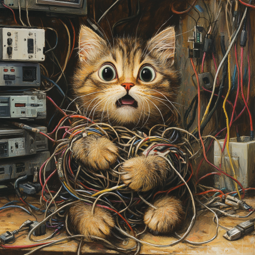 A humorous scene of a cat looking confused and tangled up in a mess of cables. The cat’s expression is one of bewilderment, with its eyes wide and ears perked up in confusion. The cables are twisted around its paws and body, creating a chaotic and tangled web. The background features a cluttered workspace or room with various electronic devices, adding to the sense of disarray.