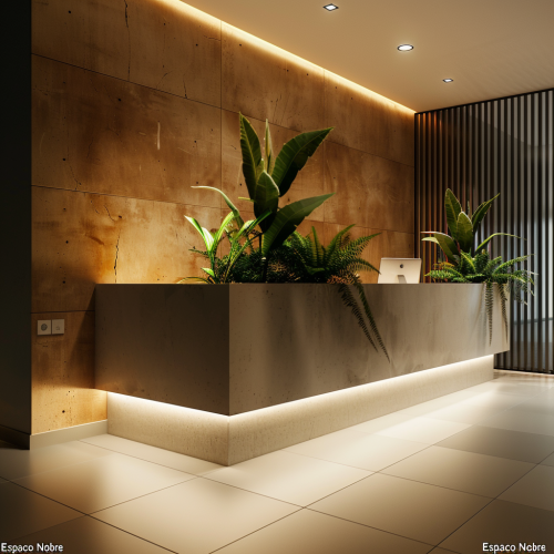 RECEPTION DESK FOR TWO PEOPLE IN THE ENTRANCE FOR HEADQUARTERS BUILDING, ORGANIC MODERN STYLE, BEHIND THE RECEPTION DESK THERE IS A TEXTURED DESIGNED WALL WITH ONE HIDDEN DOOR AT THE BEGINNING AND ONE HIDDEN DOOR AT THE END , INTERIOR, THE SPACE IS ALMOST TIGHT, luxurious DESIGN, THE RECEPTION DESK MUST BE CLOSED FROM THE TWO SIDES, THE USERS FOR THE BUILDING ARE HIGH-END INVESTORS --s 750