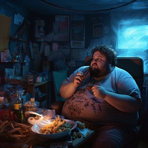 a film still of a really fat guy with a neck beard, smoking a cigarette, eating cheetos, blue tv screen light, high detail --v 5.2