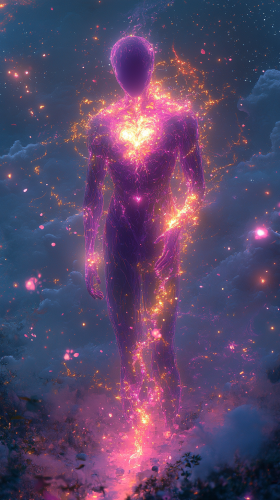 A glowing purple humanoid figure stands in a serene, ethereal landscape, surrounded by soft, radiant waves of light that symbolize love as a powerful and nourishing energy. The figure has its hands gently placed over its heart, where a vibrant, glowing aura emanates, spreading outwards in waves of pink, gold, and soft purple light. These waves represent the invisible, nourishing power of love, flowing from the infinite to the soul and body. The background is a mystical blend of cosmic elements, with stars, swirling light patterns, and a sense of harmony, capturing the essence of love as the greatest spiritual energy. --ar 9:16 --s 750