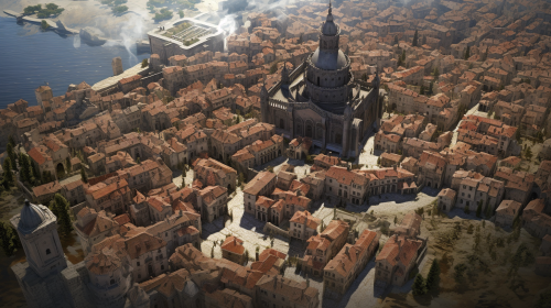 Isometric very hige viewpoin of a large medieval city, in the art style of 90 anime, in the style of studio ghibli. Light warm soft colors. --ar 16:9