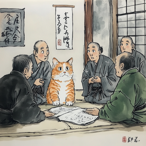 a group of happy volunteers for a pet rescue having a board meeting. Everyone is dressed casually. In the style of a high quality Japanese woodblock print