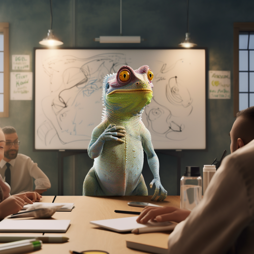 a chameleon in a meeting room with a white board behind it