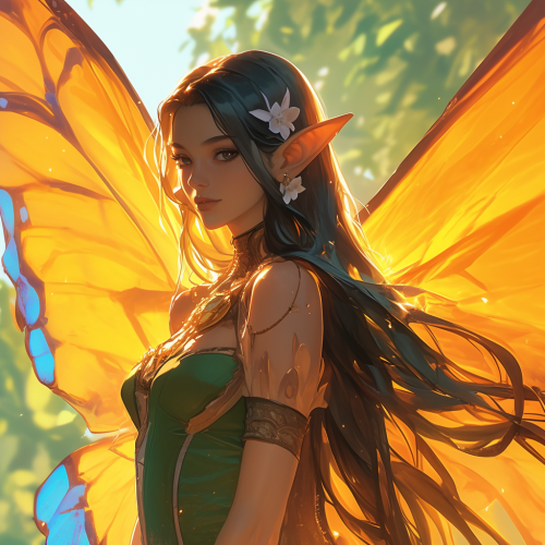 a beautiful woman, is an elf, tan skin, long black hair, dark eyes, very long pointy ears, large monarch butterfly wings on her back, gigantic magical kingdom background --niji 6