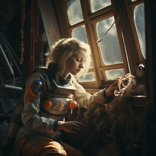 a female Polish cosmonaut cleaning windows, mood like 1970 Polish movie