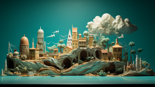 lisbon skyline featuring the word „valantic“ written origami::3 dusk::3 miniature faking::3 mint color::3 --aspect 16:9 --version 5.2