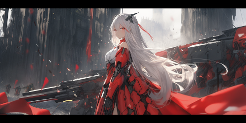 a female elf with long white hair and red eyes, wears red and white mecha armor, she waves a red and white flag above the ruins, (masterpiece), (highly detailed anime style) --niji 5 --ar 10:5