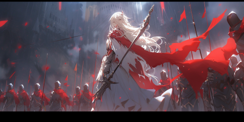 a female elf with long white hair and red eyes, wears futuristic red and white armor, but no helmet, she brandishes a red and white flag shouting victory above the ruins, it is raised from the ground by an ascending rod of bright red clods of light and is surrounded by a faint pale red aura, (masterpiece), (style very detailed anime) --niji 5 --ar 10:5