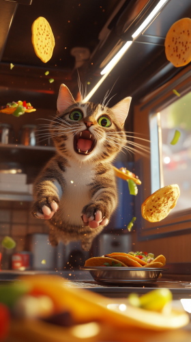 a 3D animated tabby cat frantically teleporting around a taco truck interior, motion blur trails, tacos and toppings floating mid-air, chef's shocked expression --ar 9:16