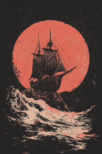 Caravel in mars, stoner illustration, t-shirt graphic, centered on a plain background, glow, old, dirty, worn, surreal, block colours, block print style, lino print style --ar 2:3