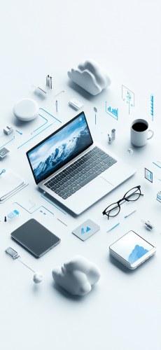 Generate a photorealistic version of Photorealistic minimalistic background with a light gray background, small elements such as a sleek laptop, a modern smartphone, a pair of glasses, and a coffee cup placed at the edges, subtle icons representing cloud computing, AI, and digital transformation, all in shades of blue, green, and white, ensuring the elements are small and do not overshadow the slide content. . --ar 443:960