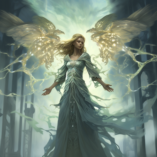 Epic wide shot, A female winged Archfey Patron deity, standing inside an old fey-garden temple, fey DnD atmosphere, 8k digital, super resolution, --v 6.0 --s 750 --ar 16:9