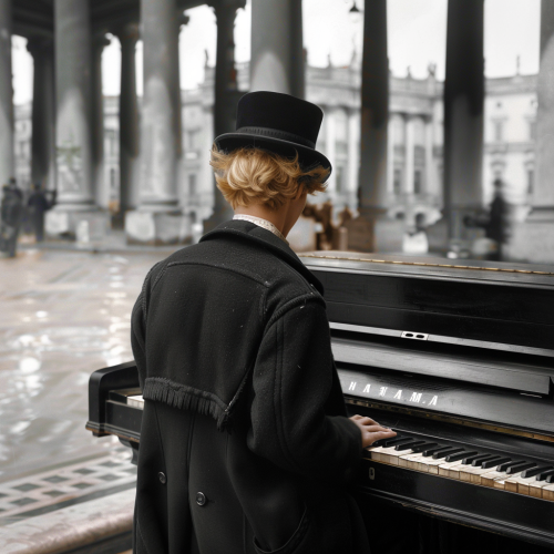 Piazza San Pietro in Trieste in 1913.. An elegant blond young man, with a typical 1913 hat, plays a piano, alone in the square black and white image with some light blue colours