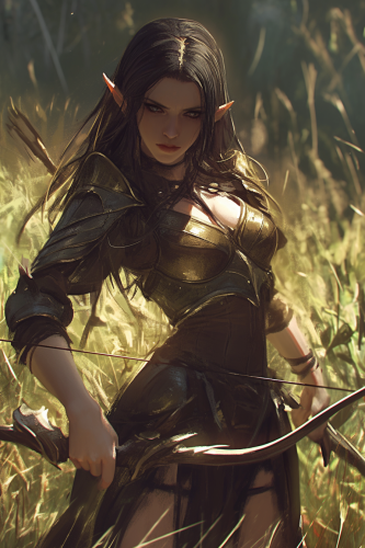 "An elf woman in her twenties who performs magic, impeccably fit, covered in tattoos, dressed in elvish attire, lying on her back in a bed facing the camera; dramatic lighting, golden hour."