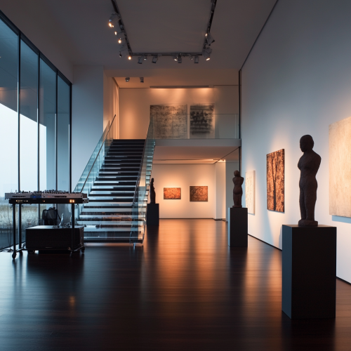 create a dark evening event in a two floored modern gallery room with plain white walls and dark wood floors, glass stairs on left to upper floor, upper floor has glass banister, spacious layout, 3 mannequins at back of the room side by side, dim and warm lighting, artwork on walls, dj booth at front left, clay structures on podiums by the right wall