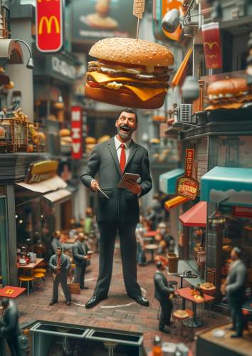 hyperrealistic image of a giant, smiling business executive wearing a suit and tie and holding an ipad, standing in the midst of a bustling collection of miniature fast food restaurants and retail stores with maintenance technicians performing maintenance tasks --ar 5:7 --v 6.0