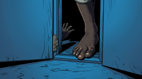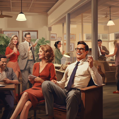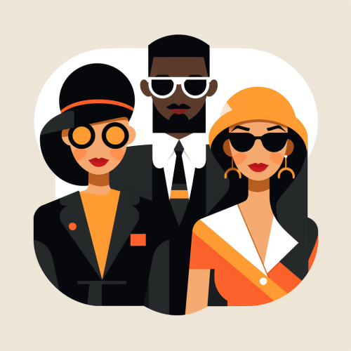 bauhaus flat illustration of a white woman, a black woman, and an indian man, professional employees, happy, looking at the camera. plain black background. use colors coral, mustard and white.