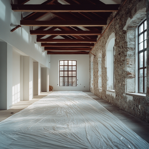 A medium shot of a renovated workroom in a modern industrial style, with white-painted walls and a single stone wall on the right side near the windows, the floor covered in temporary protective sheets, dark wooden beams at the back adding warmth, natural light pouring in from large windows on the right, low ceiling height for a realistic, cozy feel, shot with a Sony A7R IV, 28mm lens, muted earthy tones