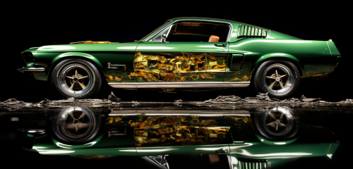 fragmented green ford mustang profile on a black background, broken up, fragmented car, juxtaposed imagery, industrial photography, auto body works, in the style of hyper-realistic car illustrations, organic chaos, classic american cars, industrial photography, kodak gold 200 --ar 128:61