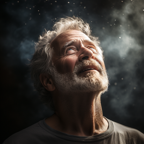 A man in his 60s looking up into heaven with an expression of wonder on his face, best photo quality