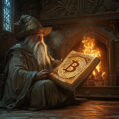 a realistic photo illustration of an old wizard sitting in front of a fireplace with a large opened book bound in bitcoins. The scene is ornate and warm.