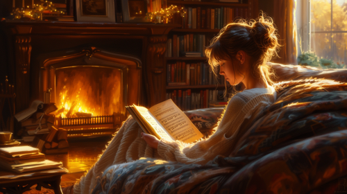 Classic piano music for a girl reading a book on a comfy couch in front of a warm fireplace --s 200 --ar 16:9 --v 6.0