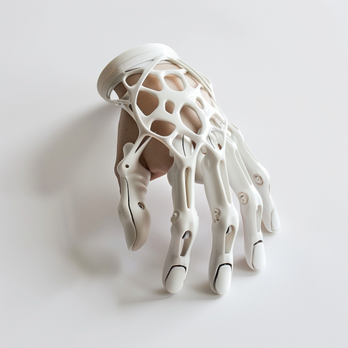 an ultra minimal and lightweight bio assistive exoskeleton made for ones hand and all five fingers to assist in opening. 3-D printed from laser scans of the patient's hand. Ultra low profile design should follow cartier in design style. Show being worn by patients in a lifestyle prescription pharmaceutical style advertising.