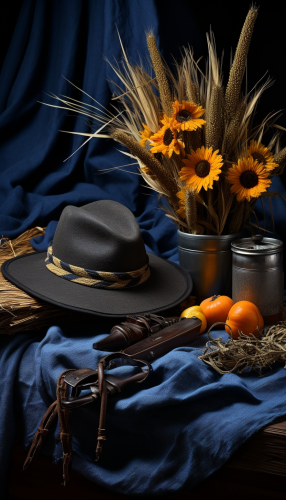 flat lay of a cowboy hat, rope, wilted flowers, gun --v 5.2 --ar 4:7 --chaos 50