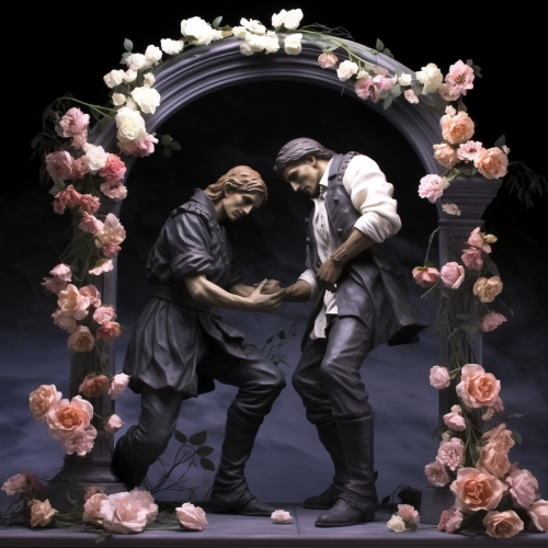 Two marble statue men under a flower arch, raining, wilted flowers, dark somber colors, full body, hyper detail