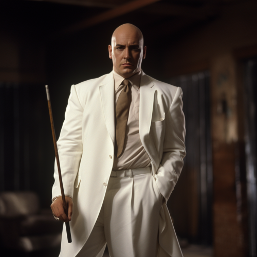 A 2 meter tall, bald and fat Caucasian actor playing Kingpin from Marvel Comics in a 1981 live action film: Hyperrealism: white suit with pocket square: with lit cigar: using a diamond cane: crime scene in the background: boss aspect of crime: shot by panavision: shot by 35 mm lens: technicolor: action scene: atmosphere action film: cinema ratio: details: panoramic shot: shadows: volumetric