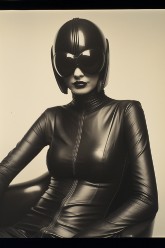 young woman in futuristic suite, latex, 1981, polaroid, bw --ar 2:3 --v 5.2
