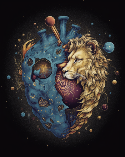 A cosmic scene, in the centre is a half lion head, half anatomical heart, gold and blue tones --v 5.0 --ar 4:5