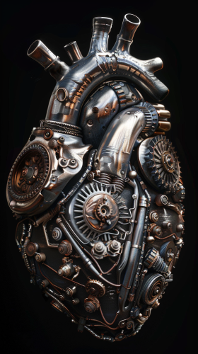A heart made of motorcycle engine parts, in the style of Michael Whelan and Frank Frazetta, dark background, detailed, realistic, steampunk style, dark background, --ar 9:16 --v 6.0