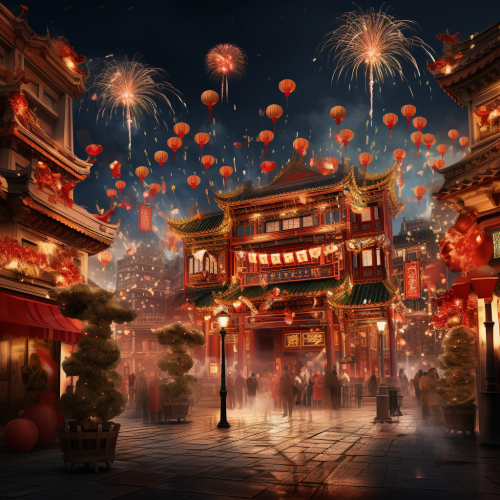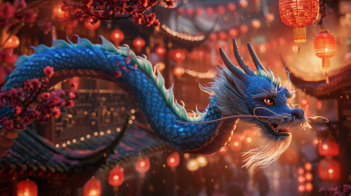 a visually stunning representation of the Lunar New Year that will leave you mesmerized from the shimmering scales of the Blue Dragon to the intricate lanterns and decorations --v 6.0 --ar 16:9