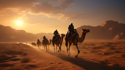 ancient arab tribes migrating through desert with camels and caravans Cinematic Lens and Lighting Very photorealism Detailed --ar 16:9