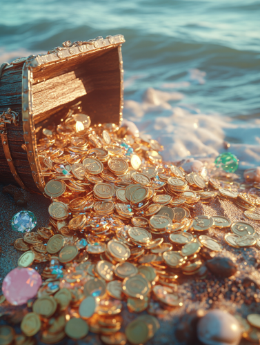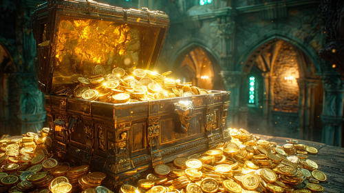 Cartoon image of ancient chest with coins, jewels, and gemstones