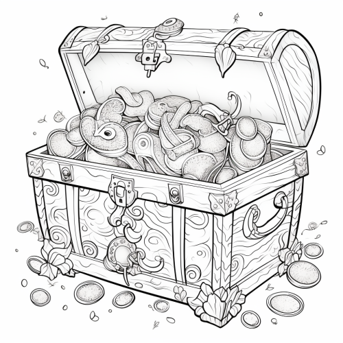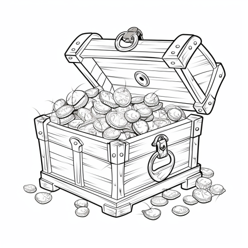 A chest with gold coins and jewels, cartoon style, coloring book, black and white, white background –ar 2:3
