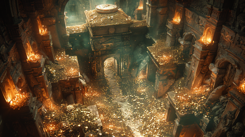 Photorealistic scene from a top-down perspective, looking down into a treasure room in a grand castle. The room is filled with gold coins and jewels, with an open treasure chest as the centerpiece, overflowing with riches. The entire room brims with treasures, creating a dazzling effect. Using Light green - yellow - orange color scheme . Soft, warm light illuminates the scene, reflecting off the treasures and highlighting the stone walls, adding to the ancient and opulent atmosphere. --ar 16:9 --v 6.0 --s 750