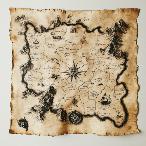 Generate a vintage-style treasure map designed intricately with hand-drawn details. The map is crafted on aged parchment, featuring faded edges. The essence of ancient cartography is captured in the map's design, showcasing an adventure-inspired illustration. The overall color palette follows a sepia tone, suggesting the map was created using a quill and ink. Several riddles and clues are hand written in various handwriting in a few spots on the map. The map should be animated and colored to appeal to children.