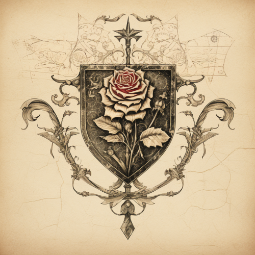 simple ancient knights crest with a detailed rose, leonardo da vinci diagram, highly detailed, sketched on old parchment, desaturated, intricate details –ar 9:16