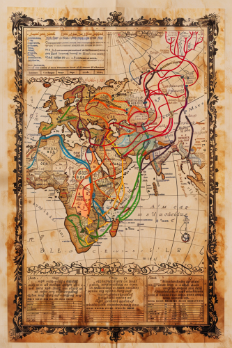 A map showing the evolution and spread of languages across continents over centuries, with colorful lines tracing the movement of languages and branching into different dialects. The map is designed to look like an ancient scroll, with detailed calligraphy and ornate borders. Warm tones, soft lighting, subtle shadows. Created Using: historical cartography, linguistic mapping, hand-drawn illustration, calligraphy, aged parchment texture, ornate design, cultural influences, detailed legends, hd quality, natural look --ar 2:3 --v 6.0
